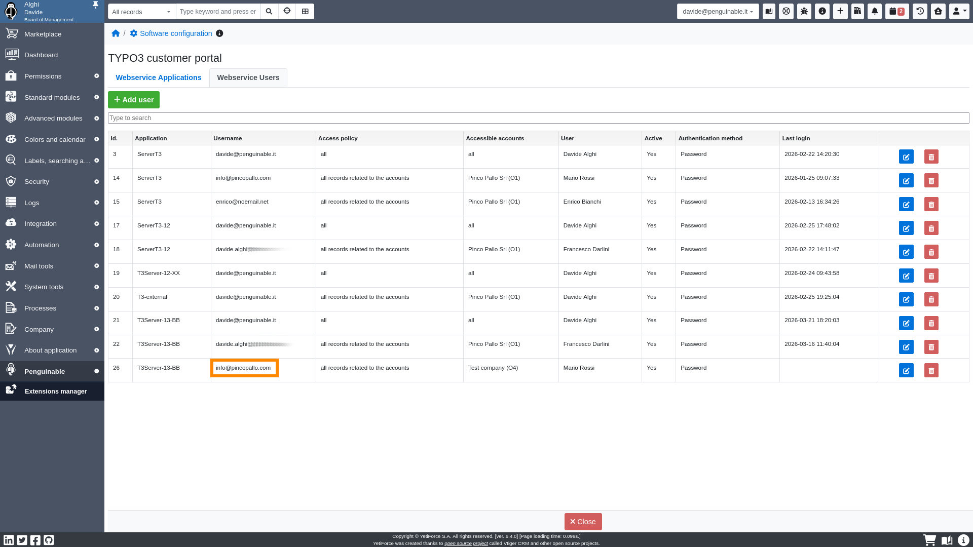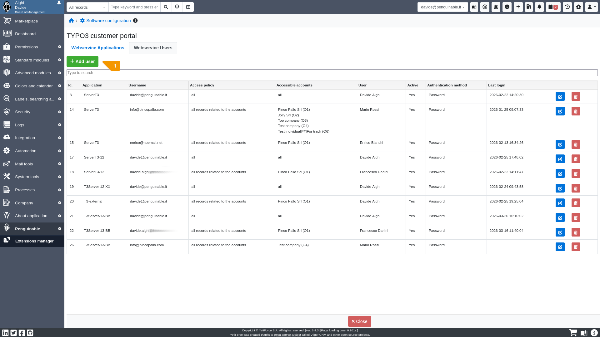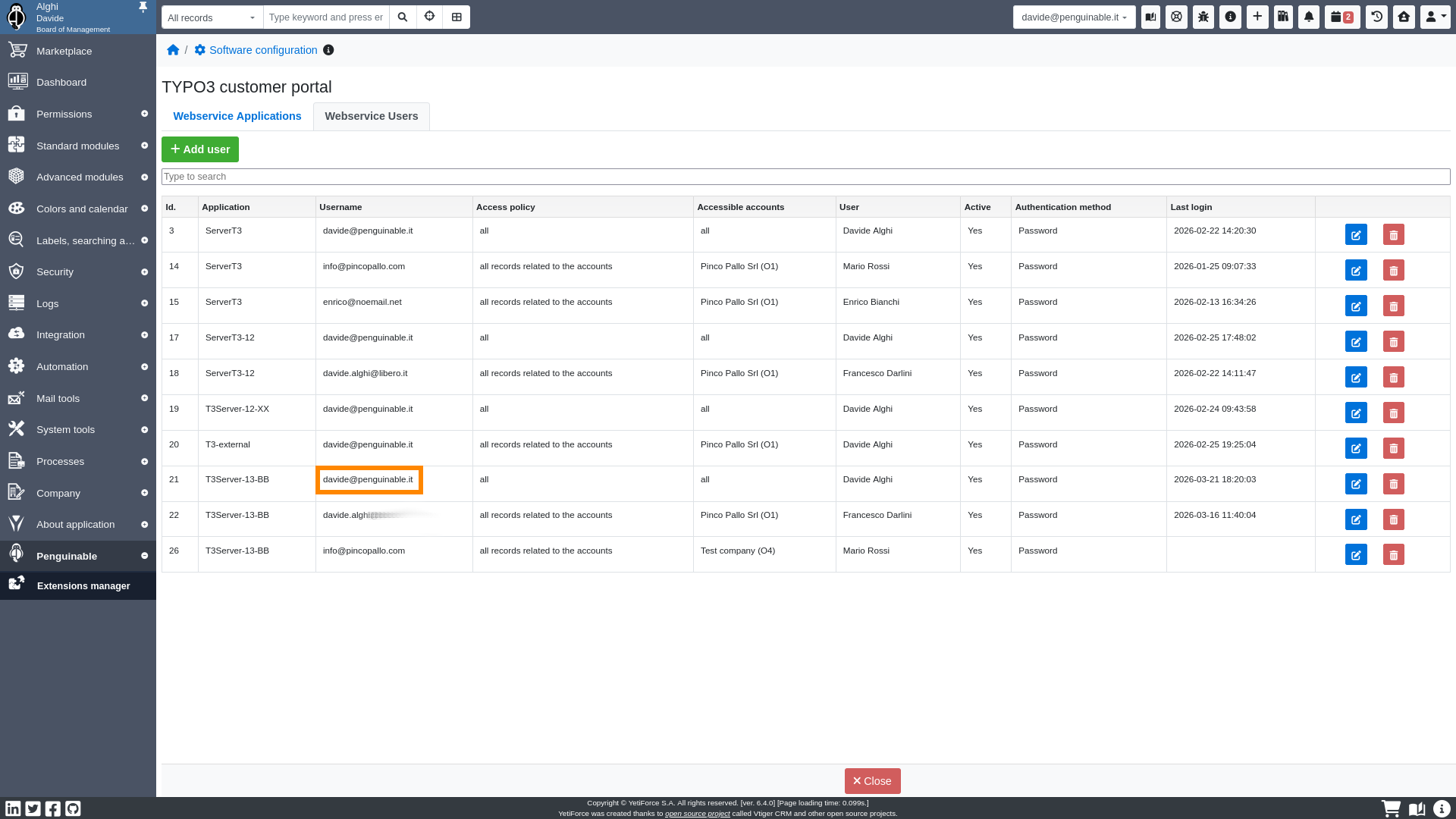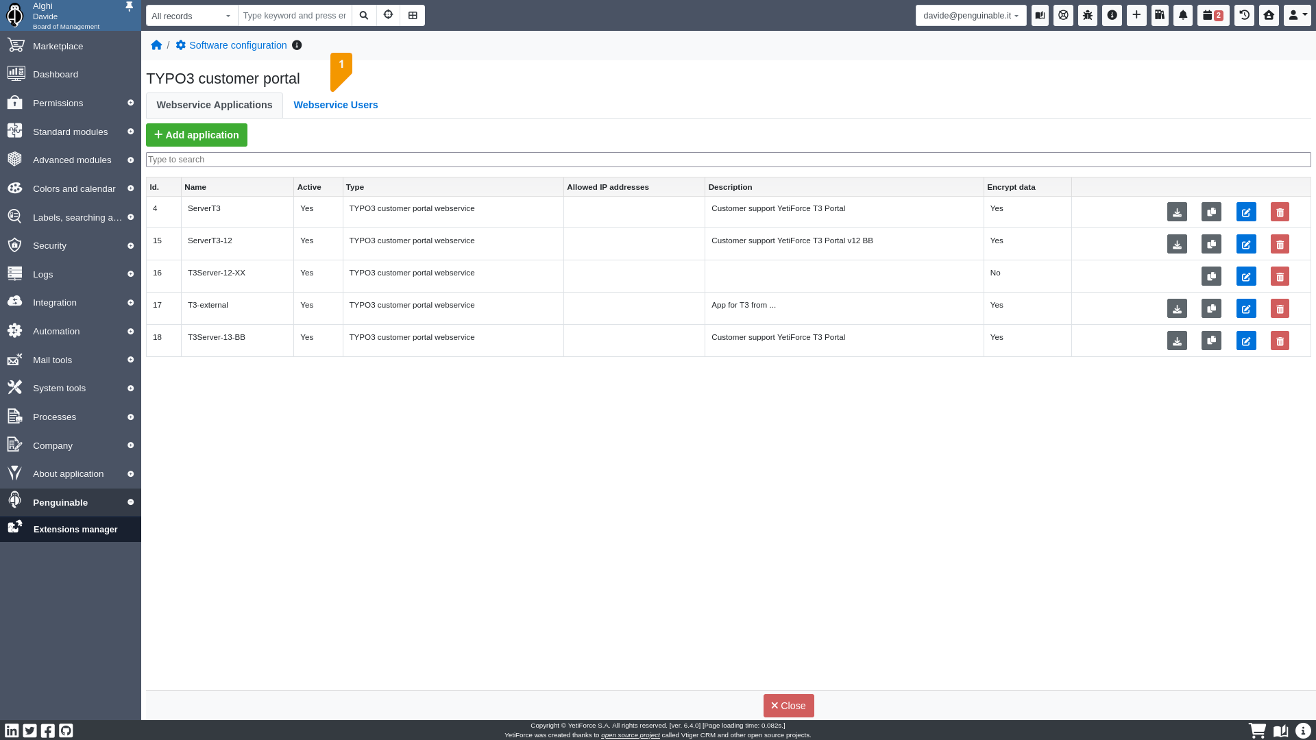 The webservice user record defines the credentials to connect to YetiForce Customer Portal.